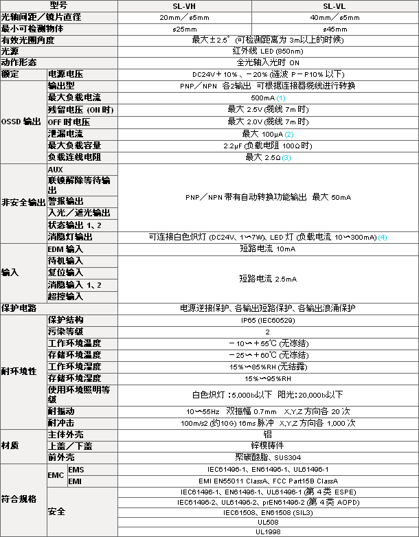 3. 为使之正常工作,要使与 OSSD 输出相连接设备的连线电阻 (可选件的专用缆线的连线电阻除外) 在 2.5Ω 以下。使用 NPN 输出,缆线长度在 15m 以上且负载电流在 200mA 以上时,要在 1.0Ω 以下。